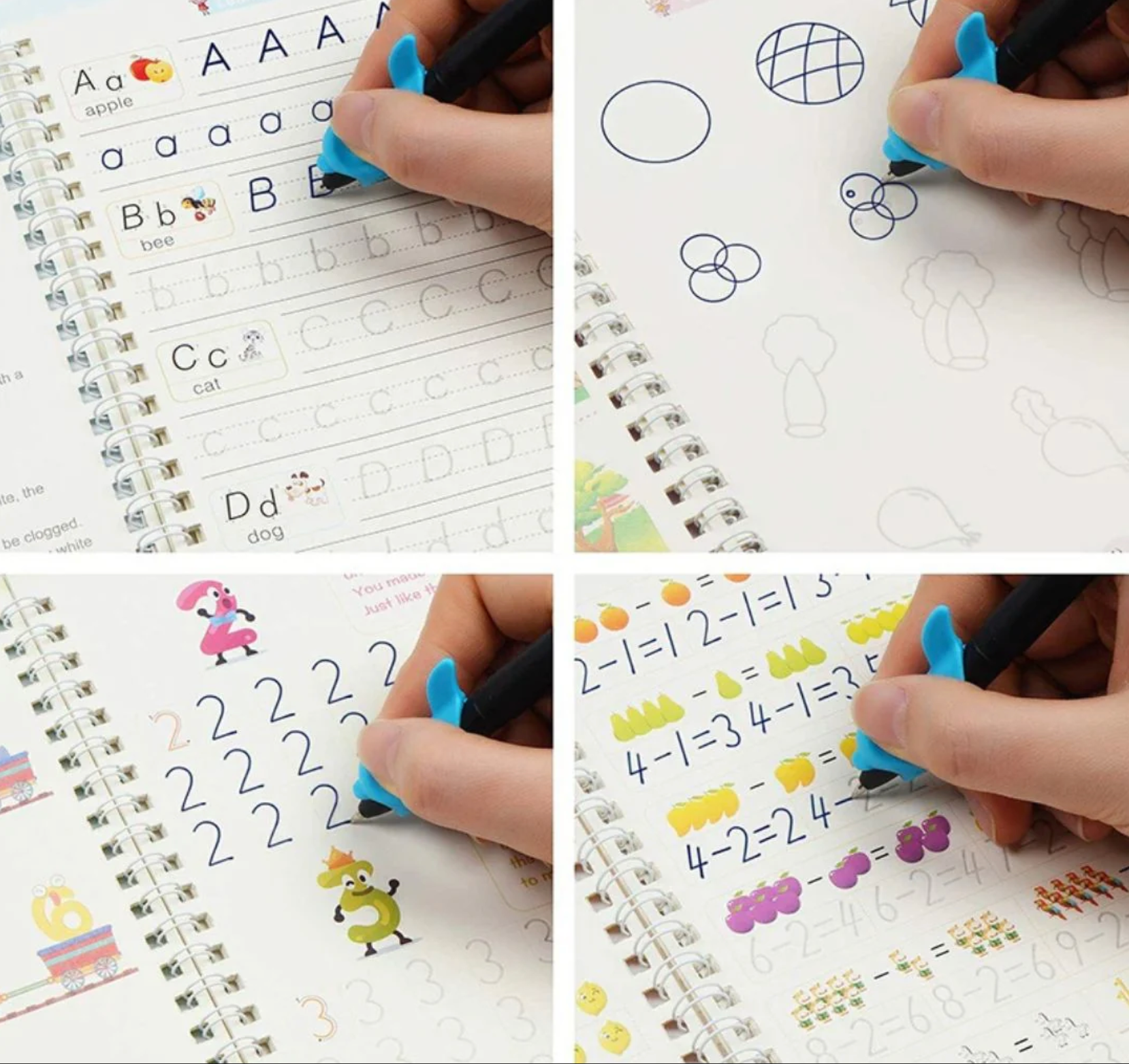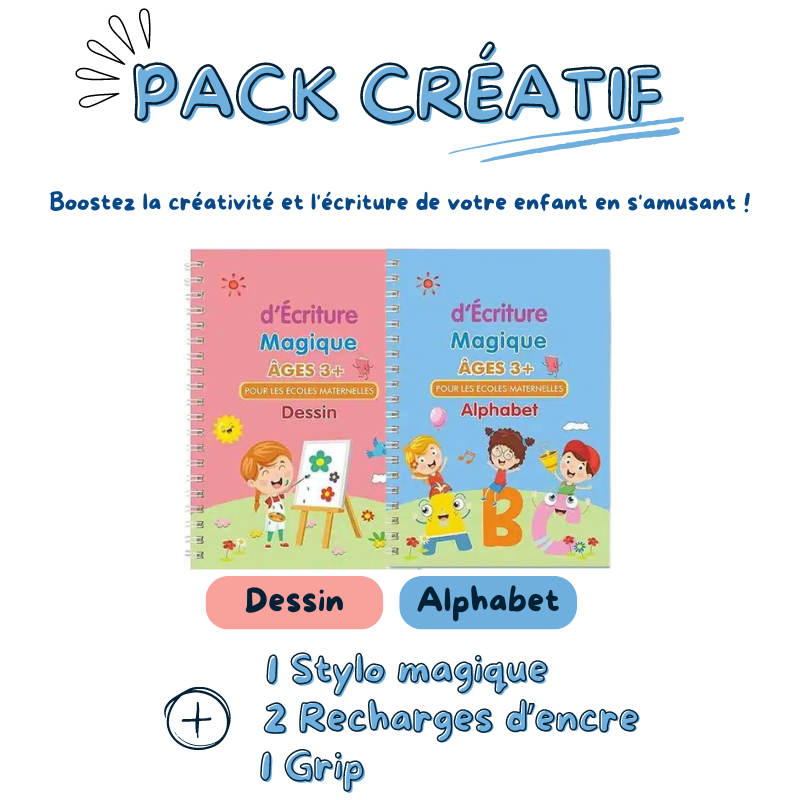 4 cahiers magiques ( 1 Alphabet, 1 mathématique, 1 numéros et 1 dessin), 1 stylo magique, 5 recharges d'encre + 1 grip.